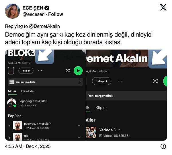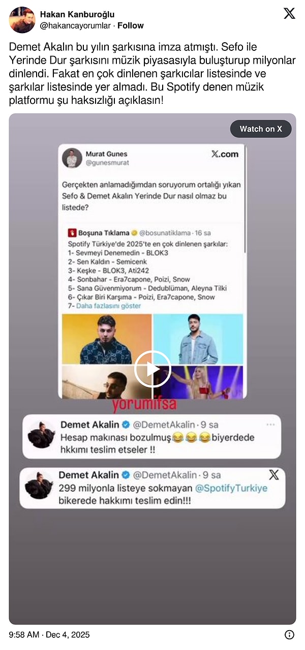 Müzik dünyasında aylardır süren 'botla dinlenme' tartışması, 2025 yılı Spotify verilerinin açıklanmasıyla yeniden alevlendi. Daha önce Sefo, Uzi ve Oğuzhan Koç gibi pek çok isim haksız rekabet ve manipüle edilmiş listeler konusunda açıkça tepki göstermişti. Son olarak yılın en çok dinlenen sanatçısının BLOK3 olarak açıklanması sosyal medyada 'bot' tartışmasını yeniden gündemin ilk sırasına taşıdı.