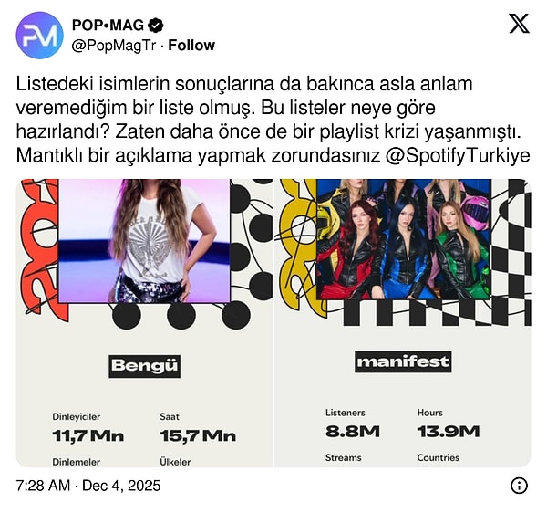 Ancak liste açıklandığı anda sosyal medyada adeta kıyamet koptu. Dinleyiciler paylaşımlarıyla hem destek hem de şüphelerini dile getirirken, bot tartışmaları yeniden gündemin merkezine yerleşti.