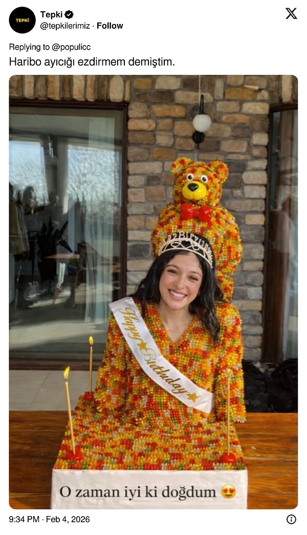 Rengarenk jelibon ayıcık temalı pastası sosyal medyada kısa sürede dikkat çekerken, tacı ve verdiği pozlar hayranlarından tam not aldı. Jelibonlardan oluşan pasta sosyal medya kullanıcıları arasında tartışma yarattı.