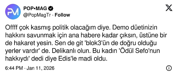Müzik dünyasında bir süredir “Spotify listeleri manipüle mi ediliyor?” tartışması alev alev yanarken, fitili ateşleyen isim yine Demet Akalın olmuştu. Akalın’ın, “Blok3 güzel şarkılar yapıyor ama orada başka şeyler dönüyor” sözleri ortalığı karıştırmış, genç rapçiden gelen sert cevap ise olayın dozunu iyice artırmıştı. Tartışma henüz soğumamışken konu hakkında düşünceleri sorulan Sefo'nun “orta yolcu” tavrı sosyal medyada hiç beklediği gibi karşılanmadı.