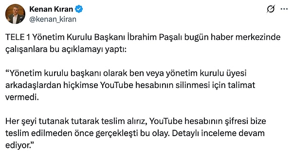 TELE1’in YouTube kanalında videolar ise ilk önce silindi ve sonrasında kanal komple erişime kapatıldı.