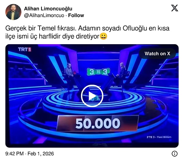 TRT 1 ekranlarında yayınlanan 3'te 3 programının son bölümüne katılan Ofluoğlu soyadlı yarışmacı gündem oldu. Yarışmacıya, 'Ülkemizdeki en kısa ilçe adı kaç harflidir?' diye soruldu. Yarışmacı, soruda uzun uzun düşününce sosyal medyanın dilinden kurtulamadı.