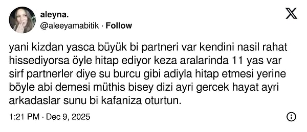 Ava Yaman'ın Taşacak Bu Deniz'de sevgilisi Oruç Furtuna'yı canlandıran, kendisinden 11 yaş büyük partneri Burak Yörük'e "abi" diye hitap etmesi birilerini nedense rahatsız etti.
