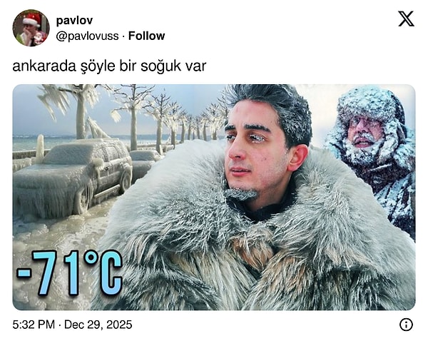 Biliyorsunuz en ufak polemikte bile ikiye bölünebilen sosyal medyada kışçılar yazcılar diye bir ayrım başladı. Tabii havaların soğumasıyla kışçılara da gün doğdu. Okulların tatil edilmesi, ülkenin neredeyse yarısının karla kaplanması derken soğuklar da X'in en önemli gündem maddesi oldu. Pek çok kişi temsili görsellerle soğukları anlattı. Bakalım mizahşörler soğuklara nasıl tepki vermiş?