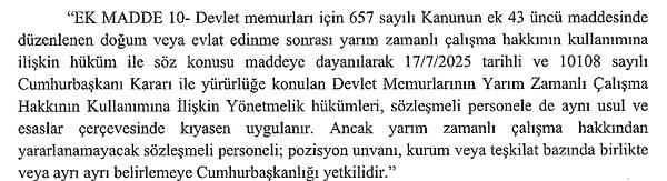 Yeni kurallar çerçevesinde sözleşmeli personel, çocuk sahibi olduktan veya evlat edindikten sonra yarım zamanlı mesai yapma hakkını memurlarla aynı şartlar ve usuller altında kullanabilecek. Uygulama, personelin ailevi yükümlülüklerini yerine getirirken iş hayatından kopmamasını hedeflerken, bu haktan yararlanamayacak istisnai personeli ve kadroları belirleme yetkisi ise Cumhurbaşkanlığı’na verildi. Düzenleme, yayımlandığı andan itibaren geçerlilik kazanarak kamudaki işleyişe dahil oldu.