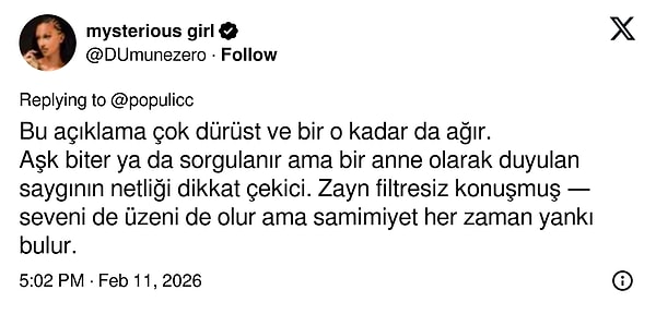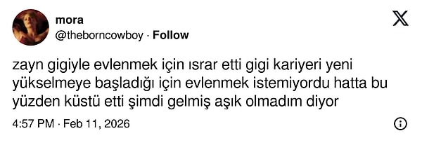 Katıldığı bir programda eski partneri ve çocuğunun annesi Gigi Hadid hakkında konuşan Zayn Malik, sözleriyle sosyal medyada büyük tartışma yarattı. Malik’in “Çocuğumu dünyaya getirdiği için ona her zaman saygı duyarım ama hiç aşık oldum mu bilmiyorum” açıklaması tepki çekti. X kullanıcıları, ünlü şarkıcının geçmişte yaptırdığı Gigi Hadid dövmesini hatırlatarak yorum yağmuruna tuttu.